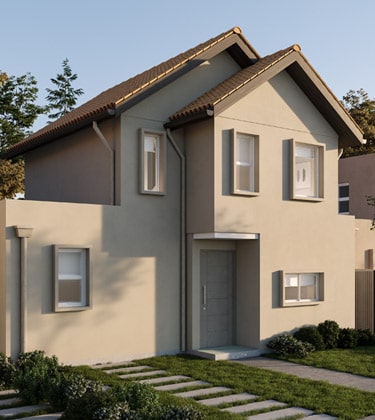 Casa tipo D de 84,91 m2 construidos, disponibles en fachada estilo Chilena o Mediterránea, cocina equipada. Dormitorio principal en suite con home office en primer piso.